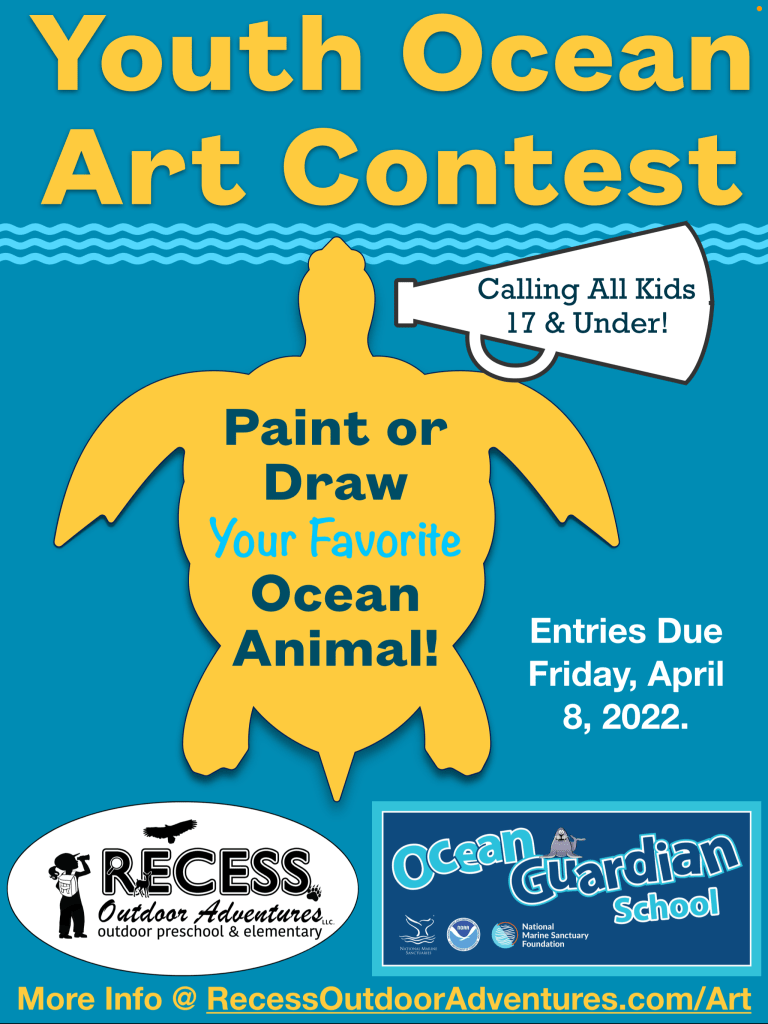 Kids 17 & younger from around the world are invited to participate! Participants are encouraged to submit a total of three art pieces (1 per each category: Ocean Wildlife, Marine Habitats, and Superhero Service Helpers). The deadline to submit art is 5 pm Friday, April 8th, 2022. A packet with official rules, tips, and an entry form is found at RecessOutdoorAdventures.com/Art