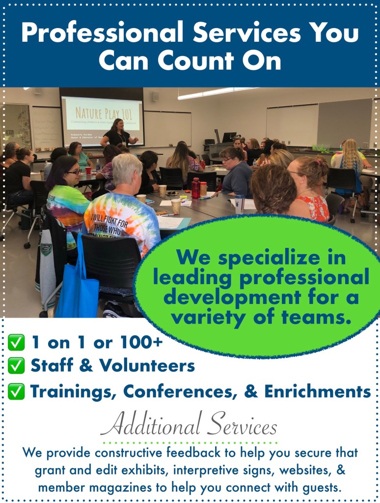 Expand Your Horizons. You Name It, We Can Help: Nature Playgrounds, Interpretive Program Development, Campground & Exhibit Design, Curriculum Writing, Volunteer Training, Internship Programs, Staff & Program Evaluations, Grants, Conservation Messaging, & Strategic Plans.